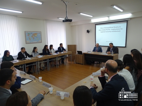 Speaking to diplomats and students of the Diplomatic School, Dr. Azizian presented the geopolitics and regional security architecture in the Asia-Pacific, spoke about the role and challenges of small nations and answered questions from the audience.